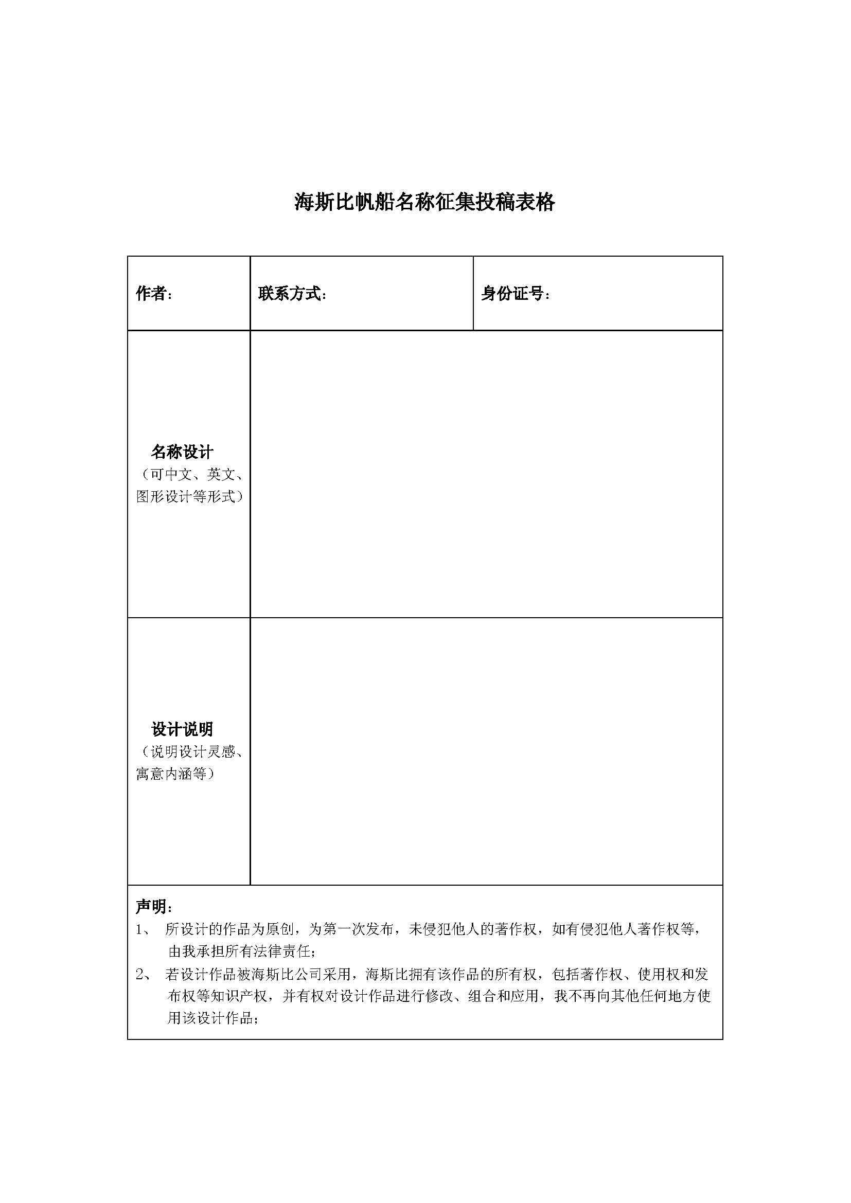 1、设计须填写在《海斯比帆船名字征集投稿表格》(见附件)中以邮件方式发送给我们,并以实际收到为准。我们以此表为统计对象。设计稿件必须附带50-100字左右的设计说明,说明设计意图、创作理念,否则视为无效投稿;