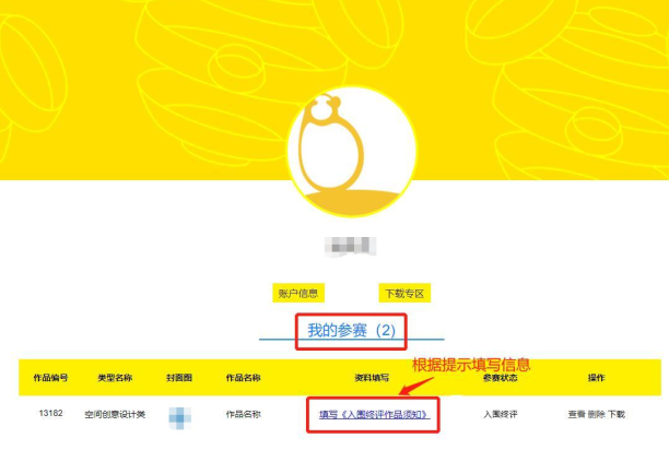 ● 查询状态:点击“用户名”,进入“我的参赛”,查看参赛结果。如查看结果显示“入围终评”,说明作品成功晋级终评,需根据提示填写《入围终评作品须知》相关信息。