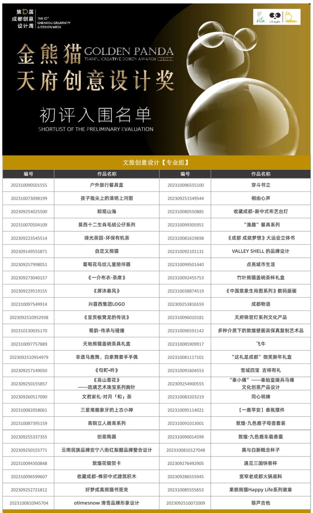 据统计,本届赛事共有来自海内外的6000余件作品入围初评,其中海外作品超过800件。经过初评,专家评审累计筛选出时尚创意设计类、文旅创意设计类、数字创意设计类和空间创意设计类四大奖项类别,每个类别80件(其中专业组50件、概念组30件),共320件作品。此外,本届赛事为继续强化“成都礼物”IP成果和品牌塑造,积极培育成都文旅消费新业态、推动文旅产业创新融合发展,分别筛选出“大熊猫·成都礼物”特别奖50件,“成都文旅消费新场景”特别奖30件,共80件作品。最终,本届“金熊猫天府创意设计奖”初评共计400件作品入围终评。