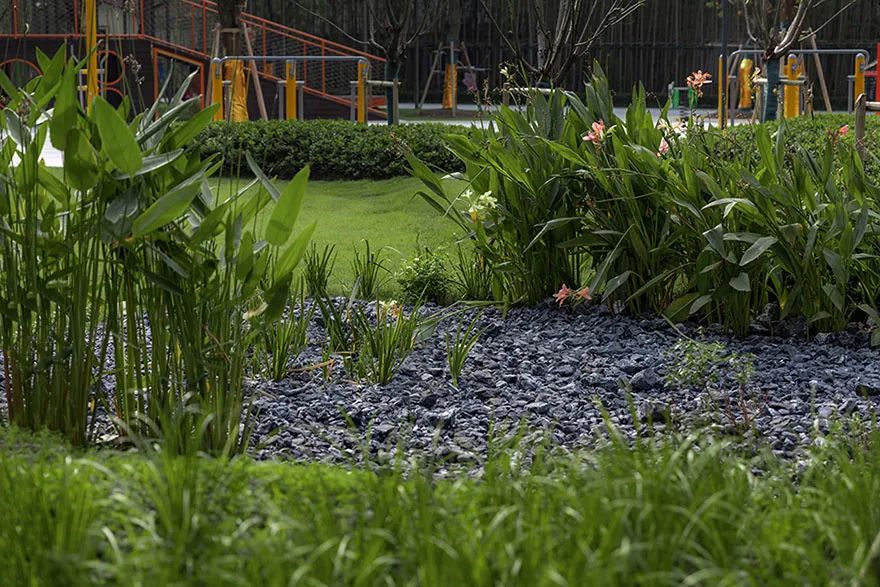雨水花园是 "丛林+"计划的一个重要组成部分。设计采用自然凹陷处理法,采用草本植物、水生植物和多年生花境植物进行植物群落搭配,与砾石带结合形成雨水花园。它不仅增强了住宅花园的景观效果,而且有利于建筑的排水和周围绿地的雨水收集。植物调色板由伞形棕榈、硬叶天竺葵、普通天竺葵等组成,都具有较强的抗湿性和抗荫性。不能完全被植物吸收的水会被自由石再次过滤和拦截,并汇集到储水区。当暴风雨来临时,降雨量超过了储水区的负荷,雨水将通过溢流口排入市政管道。