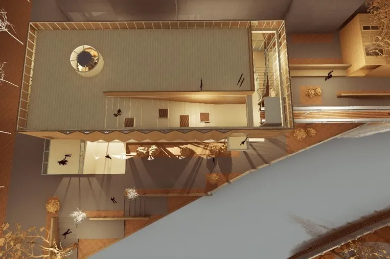 ▲由驿站延申的树廊将场所树木保留,形成了檐下全天候微庭院、绿植包裹的公厕走廊同时,创造了高线观河走廊,亲子攀岩、观鸟平台等趣味空间。