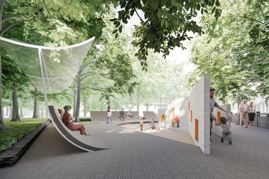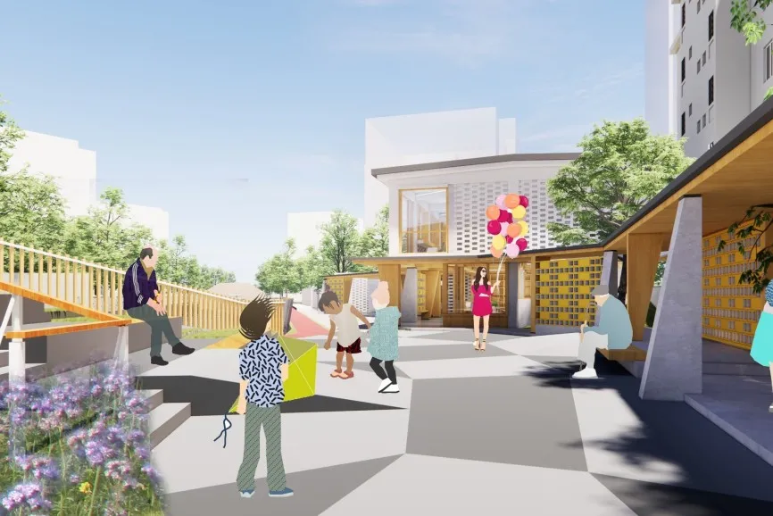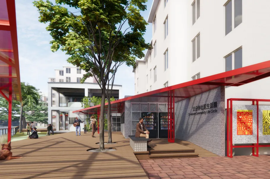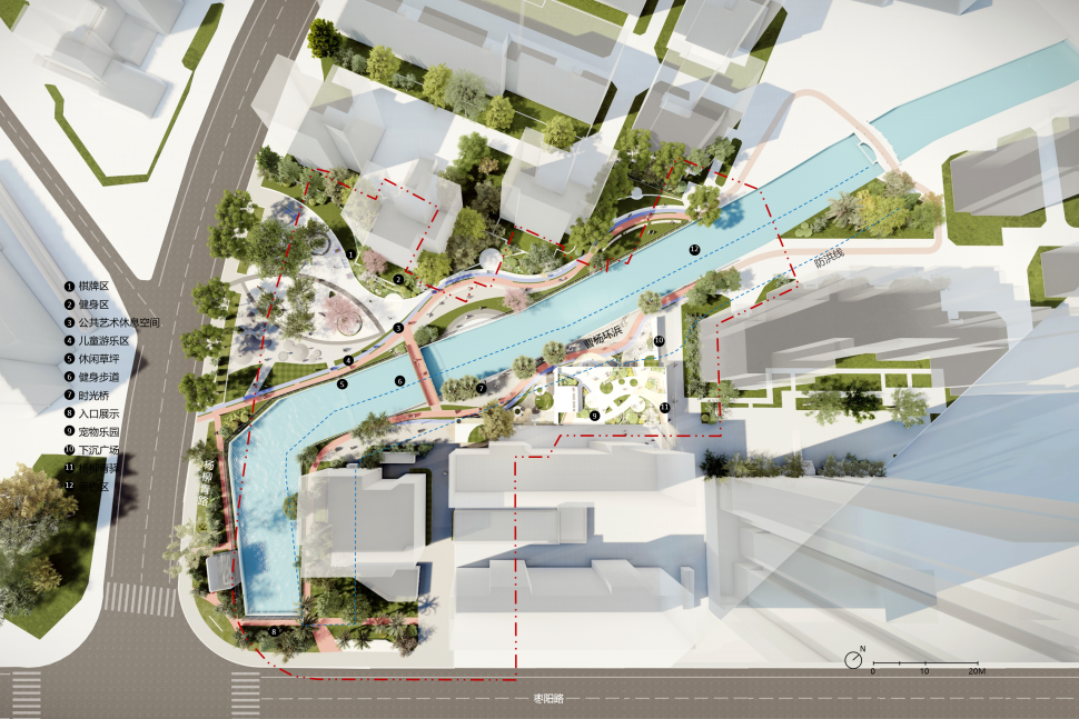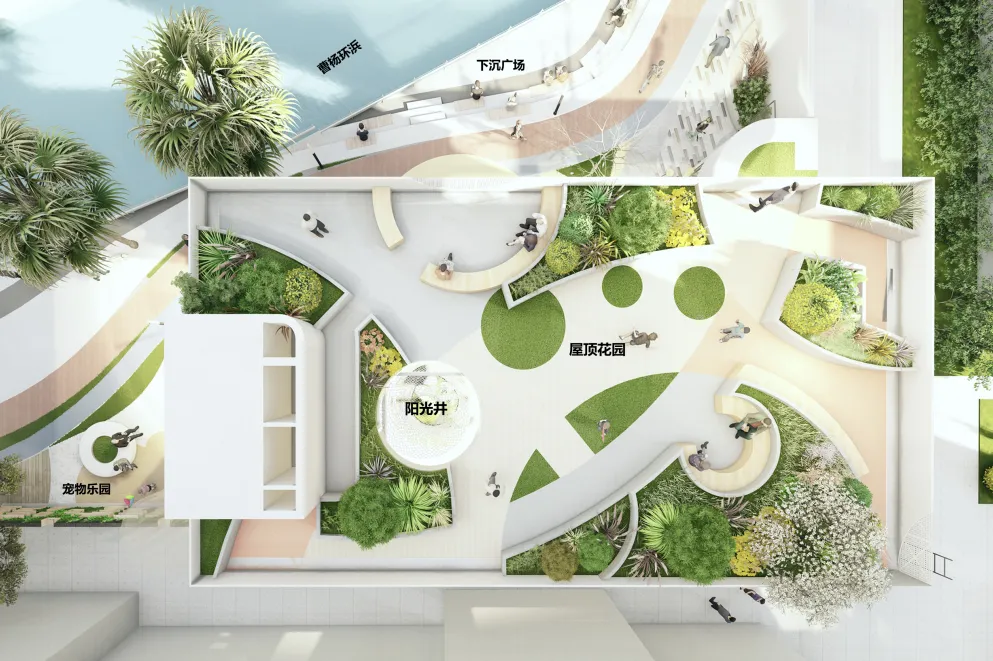 以灵动的滨水步道串联不同的多功能空间用于开展各种社区活动:浅丘起伏的空间体验为儿童游乐带来空间的乐趣;开敞的广场、幽静的草地为居民提供充满特色的休闲场所。增加了社区与驿站的联系,创造活力灰空间。