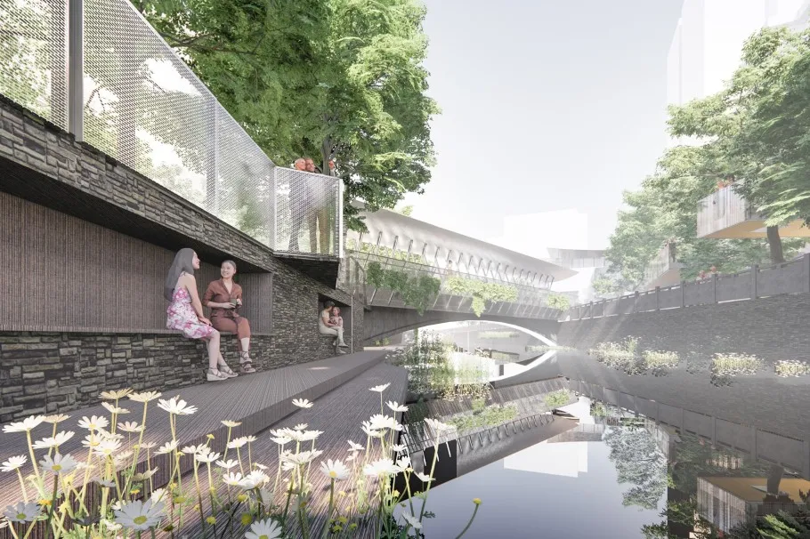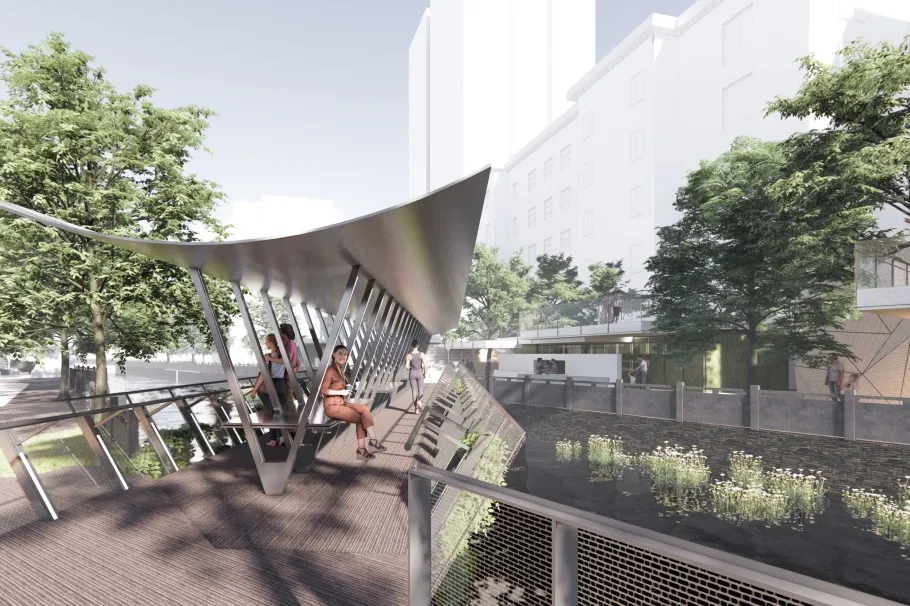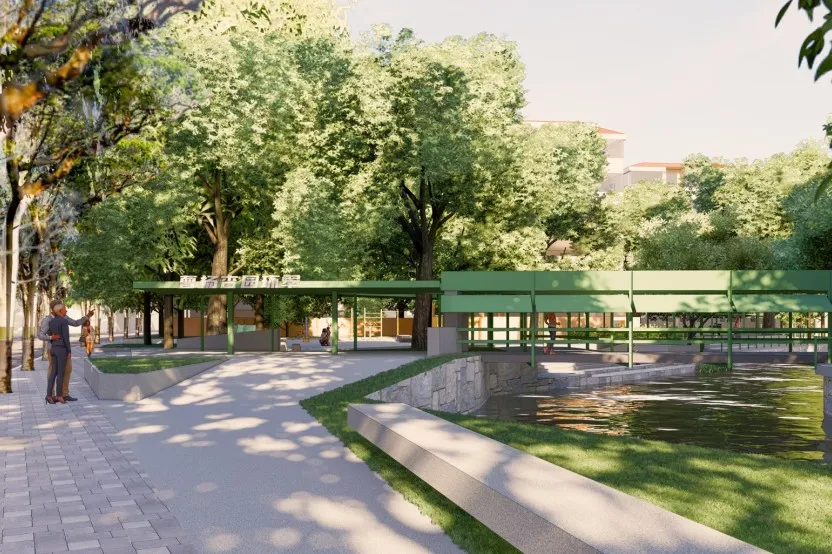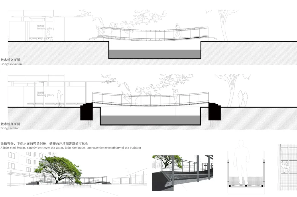此外在环浜两岸,架设一条微微弯垂,下探水面的轻钢结构桥,名“触水桥”,增加桥梁的亲水性和人们的体验感。
