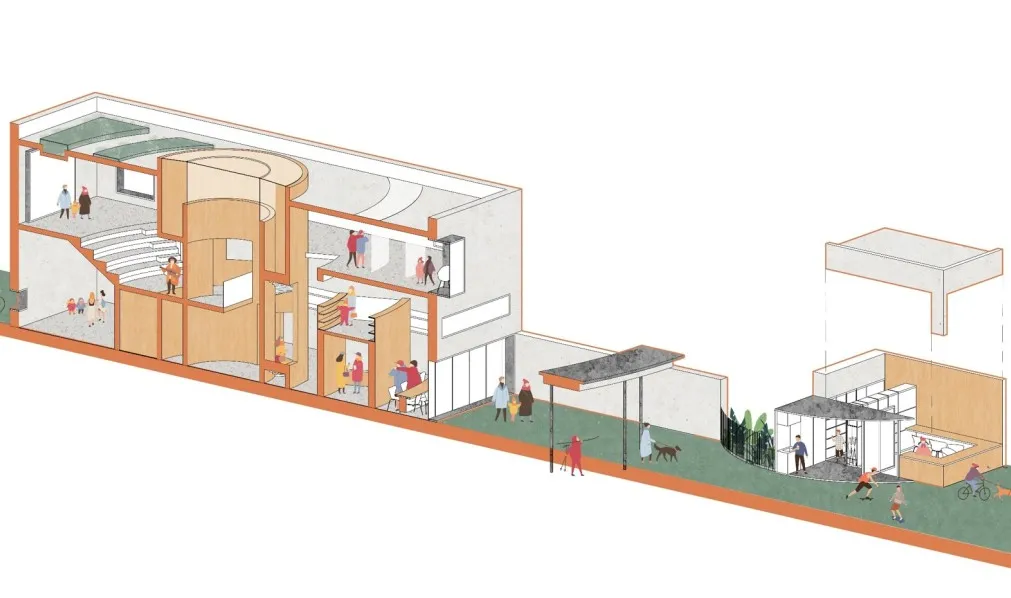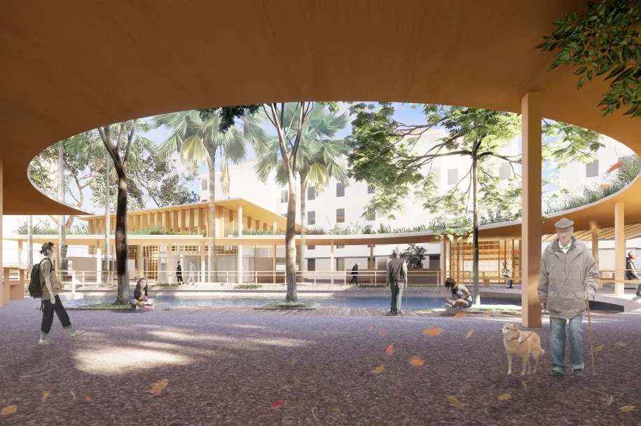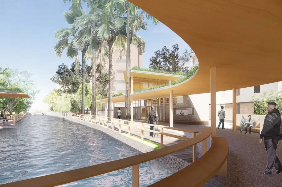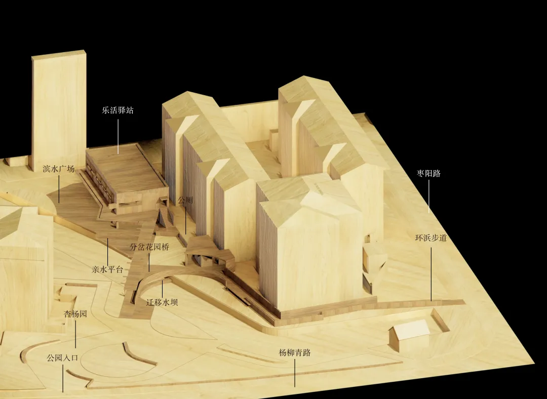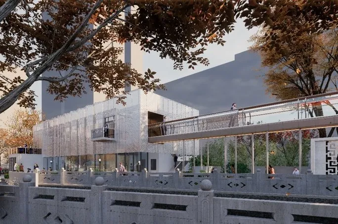 专家点评:此方案基于环浜景观贯通的整体规划,将杏杨园与对岸的连桥来重新缝合城市中的碎片化景观。设计将建筑的底层打开,结合与桥连接的雨棚和檐廊,形成开放共享、容纳多样的公共服务空间。