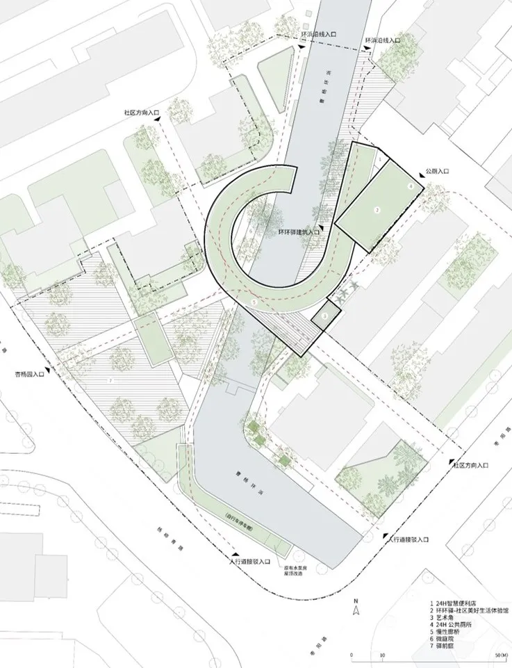 方案亮点围绕着“营造绿色社区”、“激活环浜滨水带”和“美好生活体验馆”三大主题,设置了大小不一的圆。