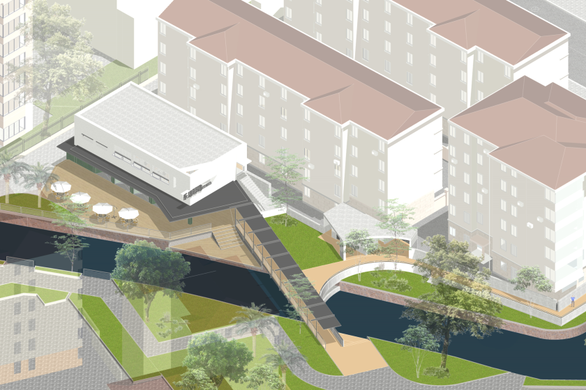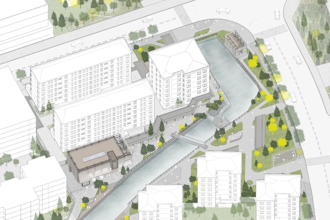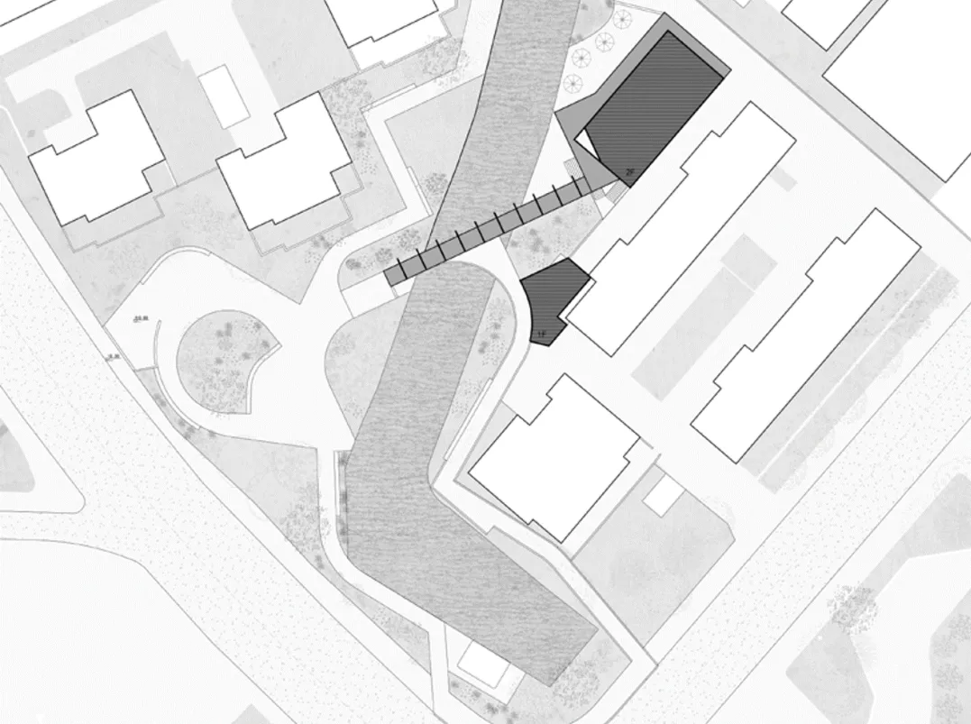 方案设计亮点是利用桥的设计将西侧住宅的轴线关系引向东侧地块,并延伸成为建筑的雨棚与檐廊,让两岸的景观与建筑在几何关系上建立联系。