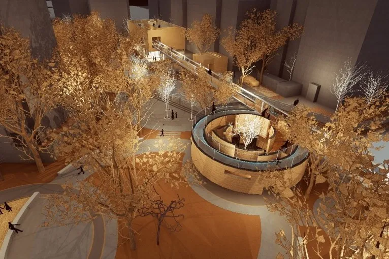 方案从树的生长痕迹中提取“年轮”概念,通过构建内部螺旋交通加外圈四层展墙来形成年轮记忆的轮溯。