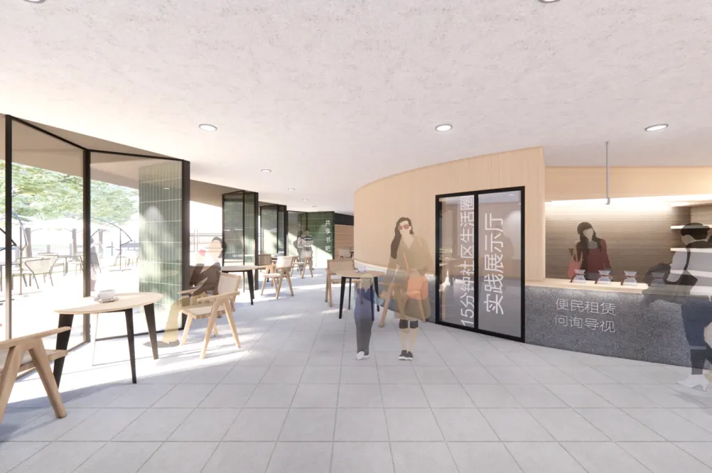 方案设计亮点是将环廊侵入至建筑红线内,形成连续的半室外空间,并通过偏转内部墙面方向,加强室内外的联系,使得建筑的西南沿水面获得最大限度的景观资源。通过环廊构筑物将城市、社区等四面八方来的人群引导至其中,进而沿着廊下进入环环驿(社区美好生活体验馆),公厕设计在建筑的东北角,拥有独立的出入口,服务于驿站的同时也可以24H服务于市民,增强场地空间的公共性与社区内部的共有性。
