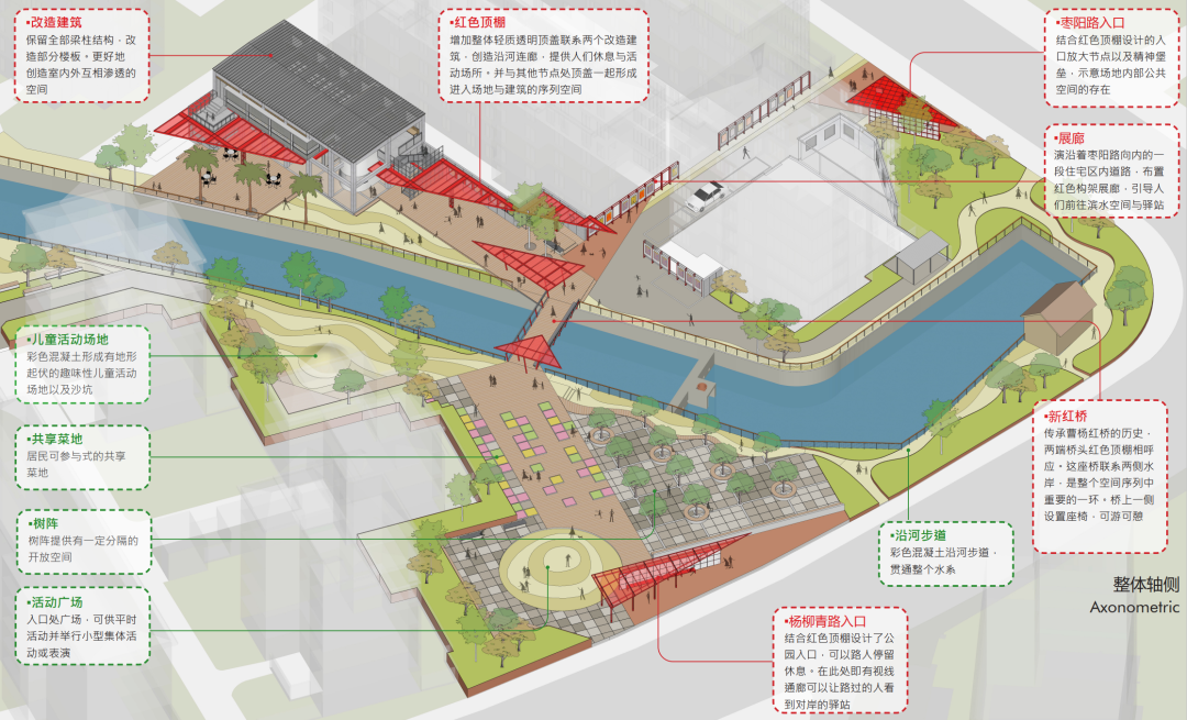 设计亮点是将原场地内一大一小两栋建筑通过围墙联系,与河岸形成夹角,空间关系被动消极。与曹杨新村的红色精神传统相呼应,构筑物均采用红色钢结构与红色阳光板顶棚,保持共同的建造逻辑与变化的光影效果。
