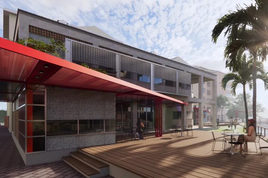 生活馆的现状由一个框架结构的二层建筑及其附属构筑物组成,通过降低南侧建筑结构,为紧邻的建筑争取更多的日照与视线通廊,同时通过一层贯通的折叠门扇与二层的落地窗,打通建筑内部与水岸的界限,水岸的公共活动与周围的景色可以更广泛地进入建筑内部,为一层的阅读与茶歇提供绝佳的室内品质。