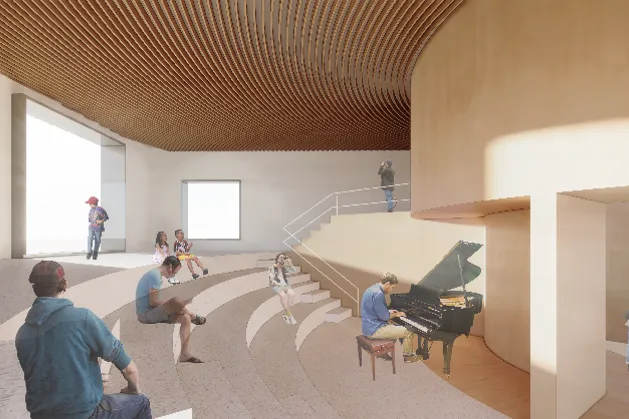沿用圆的元素,在建筑中央嵌入一个双层木质光筒,楼梯环绕圆筒螺旋而上,集约地解决竖向交通和服务用房,从而使得建筑外立面获得自由开放。
