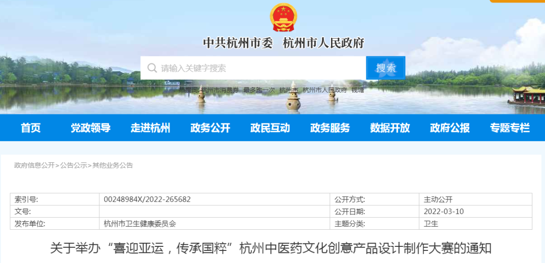为了喜迎2022年杭州亚运会,充分展示中华瑰宝魅力,积极营造亚运文化氛围,有效推动中医药传承创新发展,根据《杭州市卫生健康事业发展“十四五”规划》和《中共杭州市委 杭州市人民政府关于促进中医药传承创新发展的实施意见》等部署要求,经研究,决定举办“喜迎亚运,传承国粹”杭州中医药文化创意亚运产品设计制作大赛。现将有关事项通知如下: